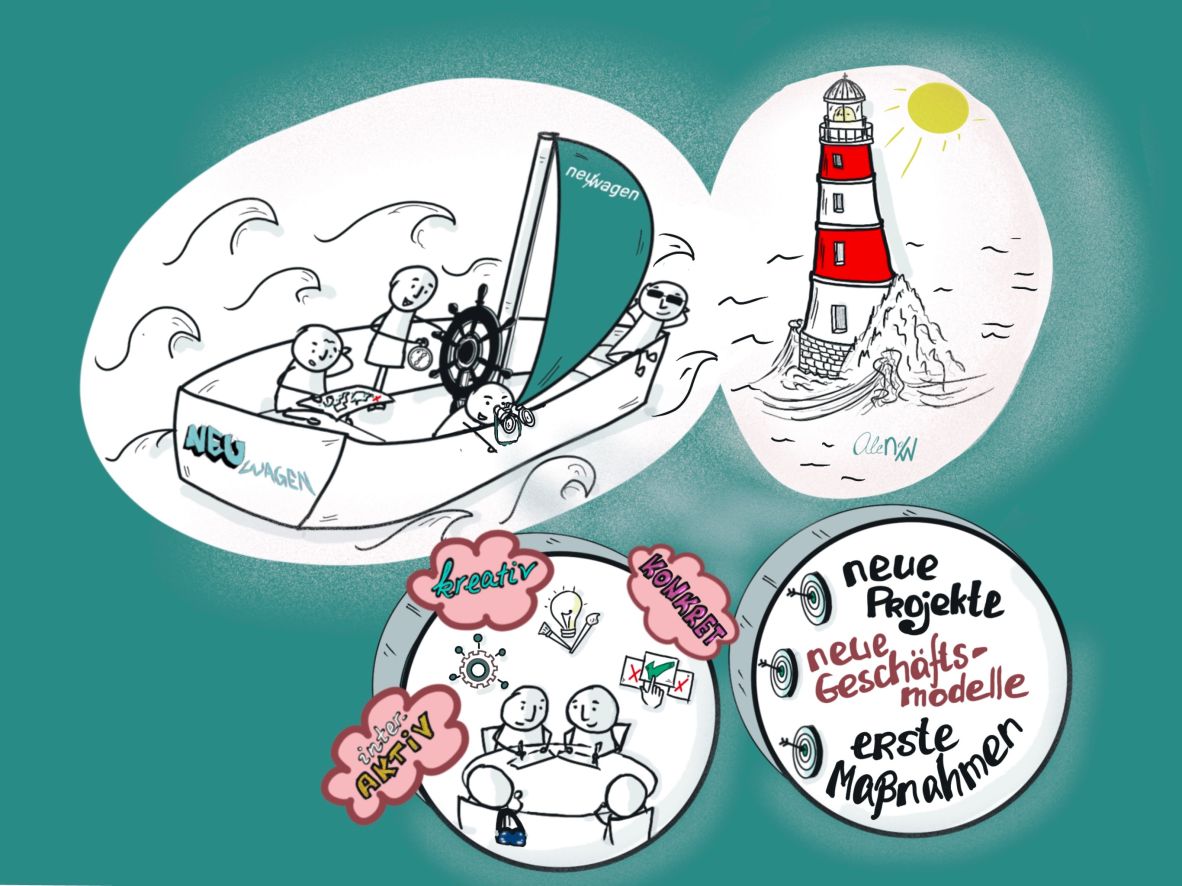 Das Transformationsnetzwerk neu/wagen hat das Format „Zukunftsbild-Workshop“ bereits mit den regionalen Wirtschaftsförderungen sowie Mitgliedsunternehmen von der IG Metall und der IHK erfolgreich umgesetzt. Sehr positives Feedback und spannende Ergebnisse haben uns dazu bewegt, das Angebot anzupassen und zu erweitern.